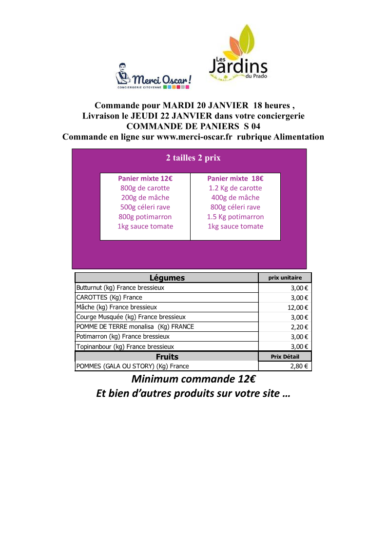 Commande du jeudi au mardi 18h. Livraison vers 11h le jeudi sur votre conciergerie.
