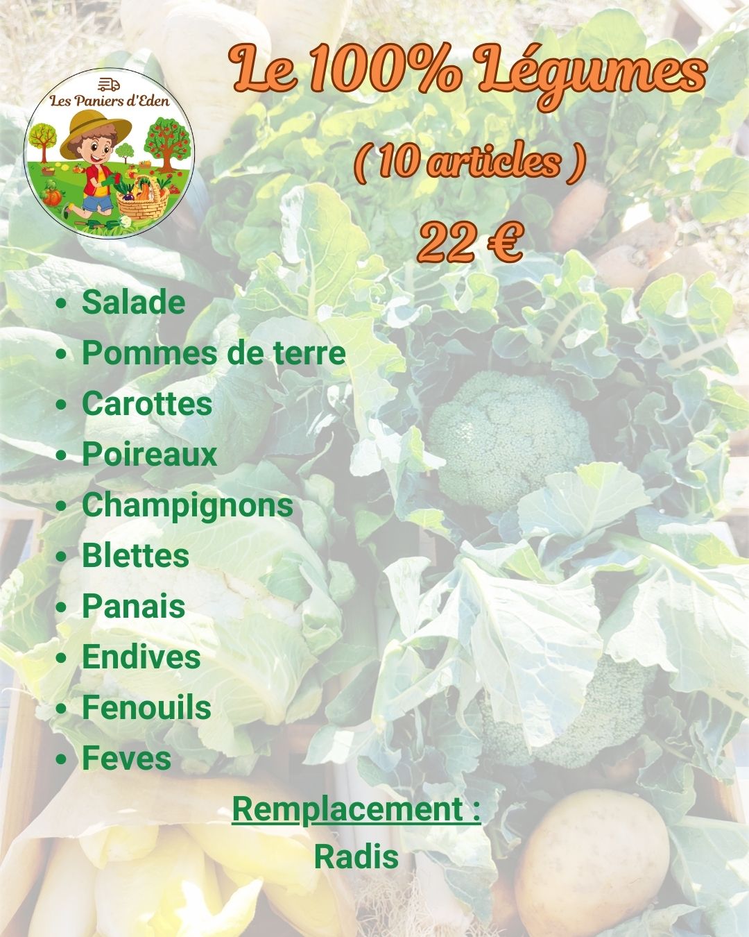 - Le 100% Légumes à 22€ : composé de 10 articles