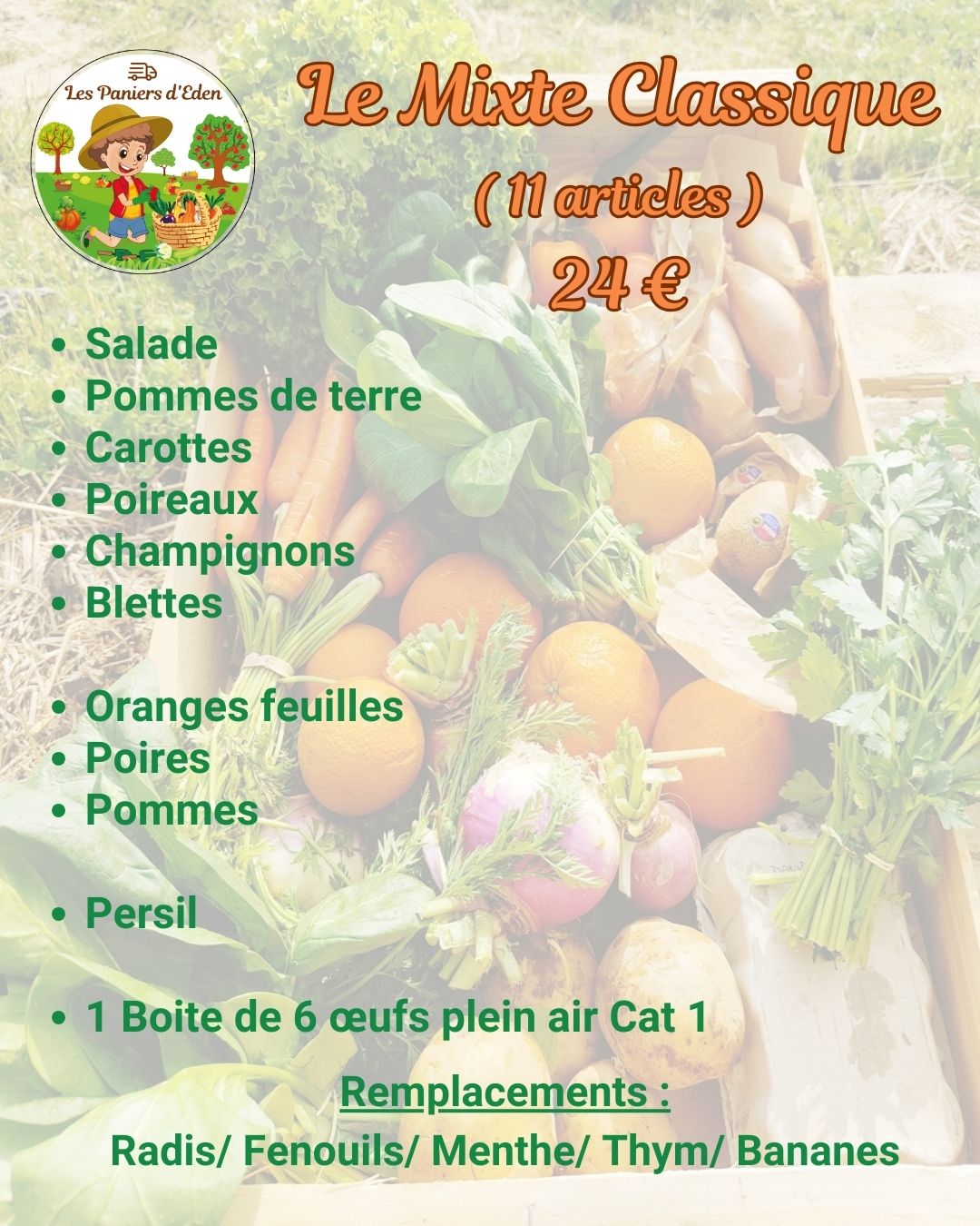 - Le Mixte Classique à 24€ : un panier mixte composé de 11 articles dont une boîte de 6 œufs plein air