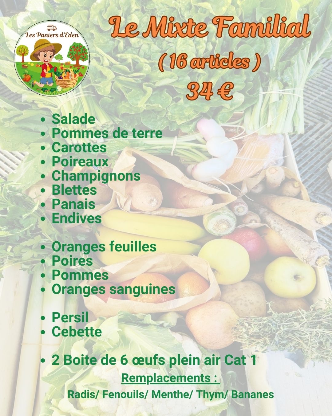 - Le Mixte Familial à 34€ : un panier mixte composé de 16 articles dont une ou deux boîtes de 6 œufs plein air